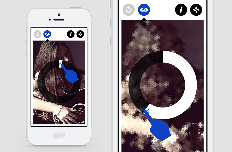 When no activity is occurring, or the finger has left the screen, the circular mixer is muted in colour to give a clearer view of the image behind it.