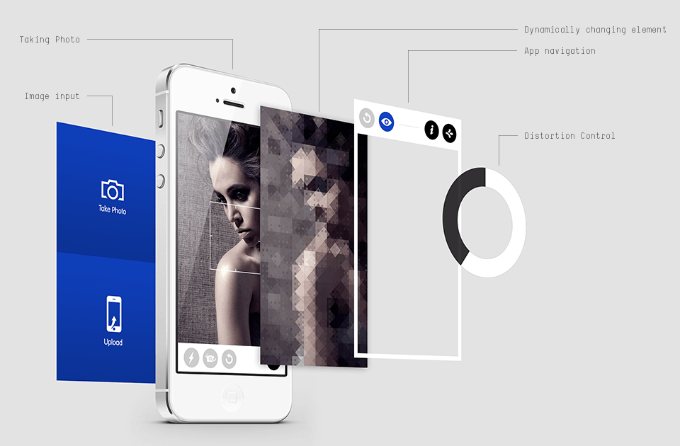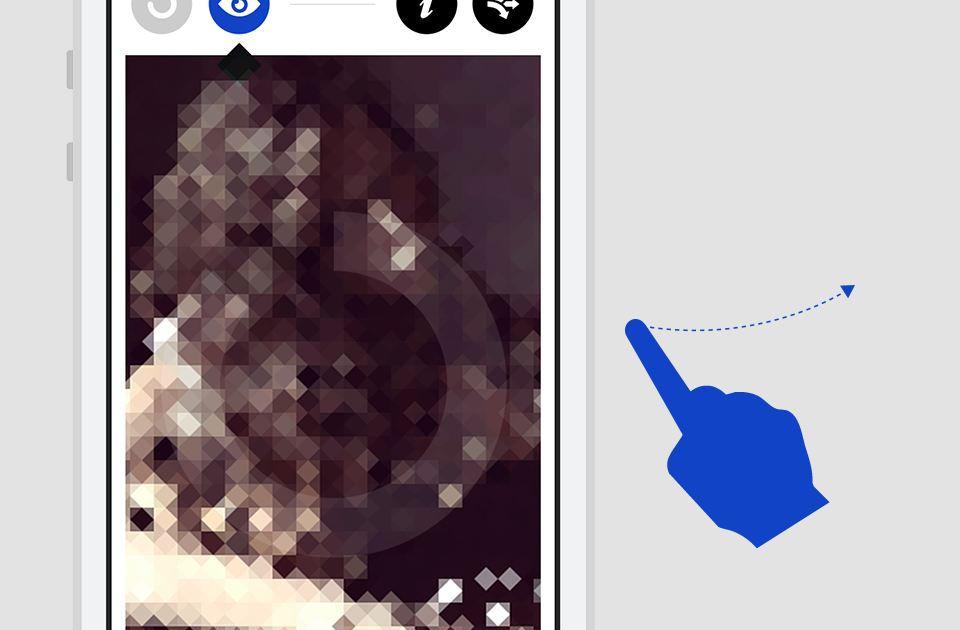 By rotating the circular gauge clockwise, the image gets broken up into multiple shapes, which create the unique pixelation effects.